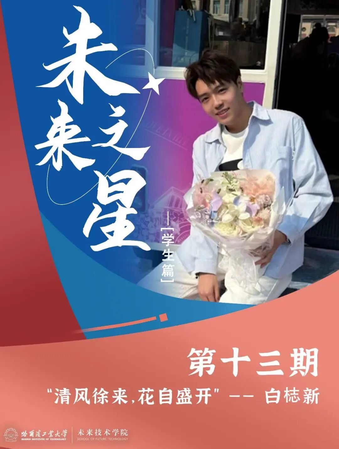 白梽新,中共党员,未来技术学院数据科学与大数据专业2021级本科生,推免至哈工大深圳校区计算机科学与技术专业攻读硕士研究生。现任2136006团支部书记,曾任未来技术学院学生会文体部部长,曾获 “黑龙江省优秀毕业生”、“优秀学生标兵”、全国大学生信息安全竞赛国家级一等奖、美国大学生数学建模竞赛M奖、第十届ACL-SIGHAN最佳学生论文奖等荣誉称号及奖项30余项。