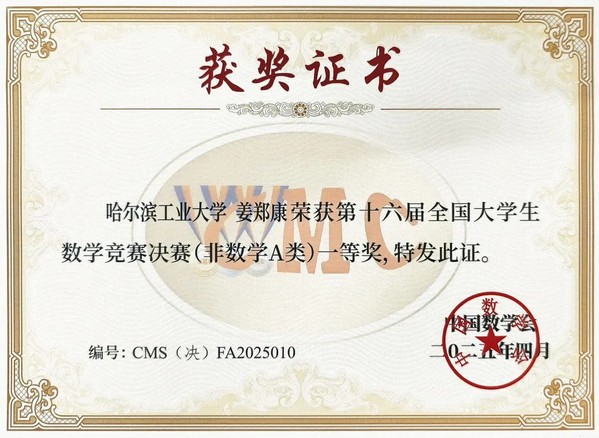 姜郑康获得全国大学生数学竞赛决赛(非数学A类)一等奖等荣誉奖项